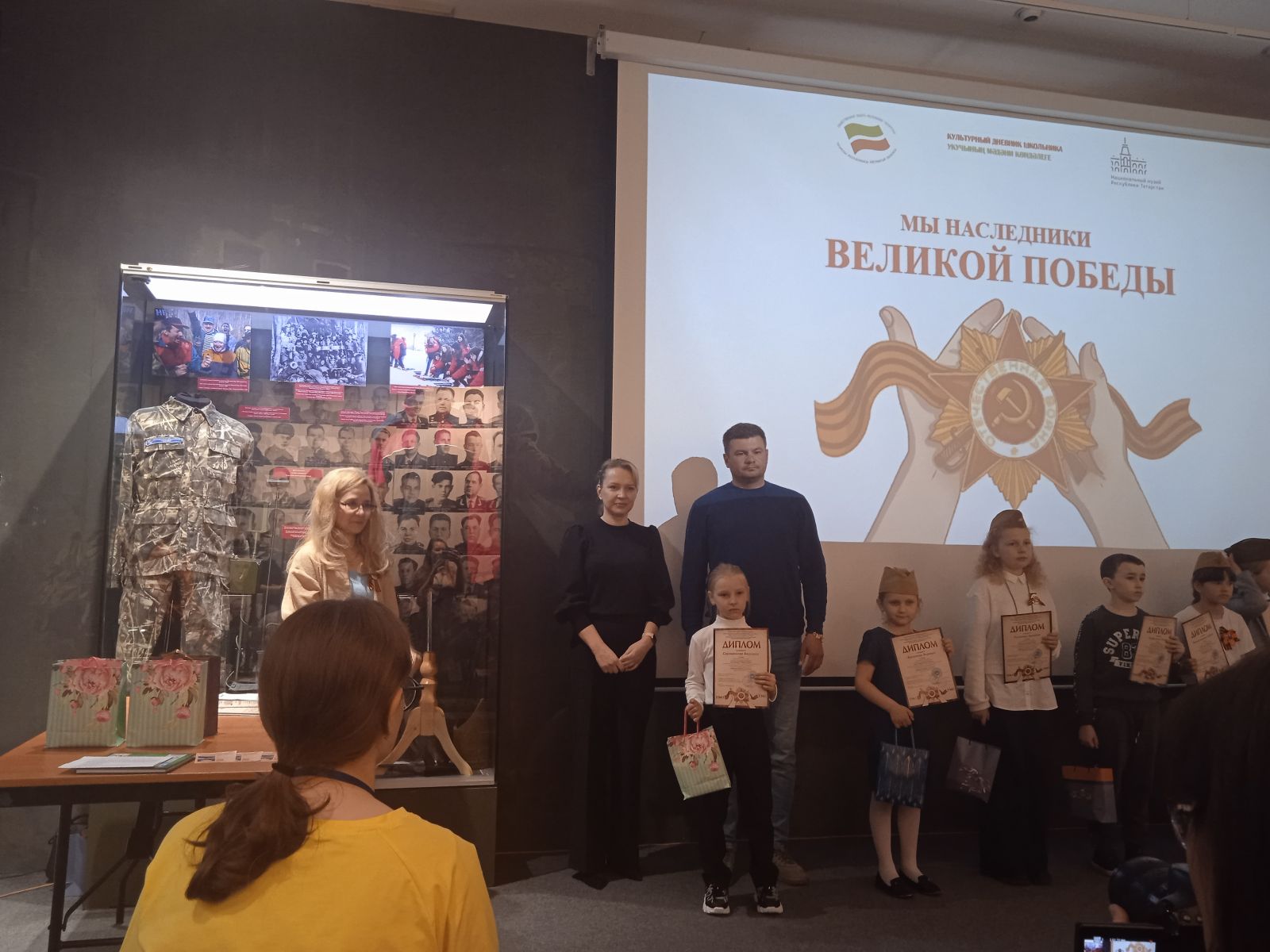 14 мая 2023 г. в Казанском Кремле наградили победителей республиканского конкурса «Мы наследники Великой Победы», посвященного 78-летию Победы. Конкурс был организован Общественной палатой РТ, музеем-мемориалом Великой Отечественной войны совместно с объединением «Татармультфильм». Учащихся 1-4 классов республики – участников конкурса – поздравили и вручили подарки победителям Председатель Комиссии по делам молодежи, развитию добровольчества и патриотическому воспитанию Общественной палаты РТ Тимур Камалетдинов и научный сотрудник музея-мемориала ВОв Анастасия Былинкина.