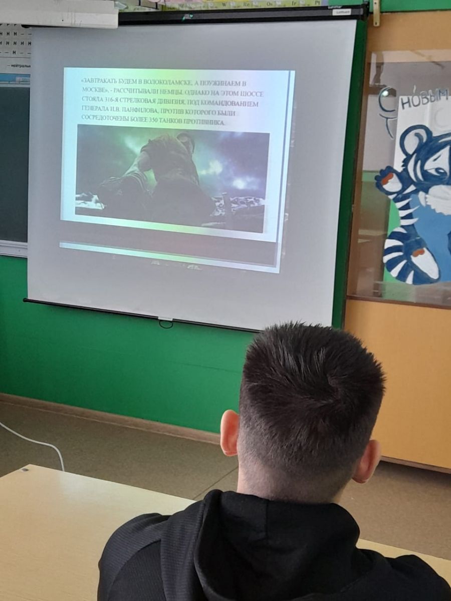 С 14 по 18 ноября 2022 г. в 1-10 классах был проведен классный час "Подвиг панфиловцев", посвященный 28 панфиловцам, сдерживавшим фашистов на подступах к Москве в 1941 году