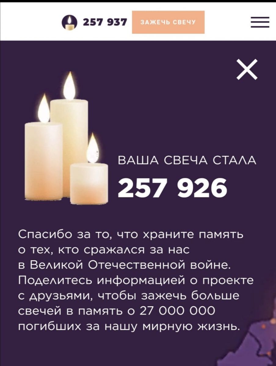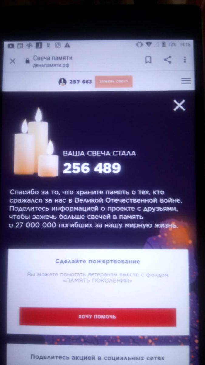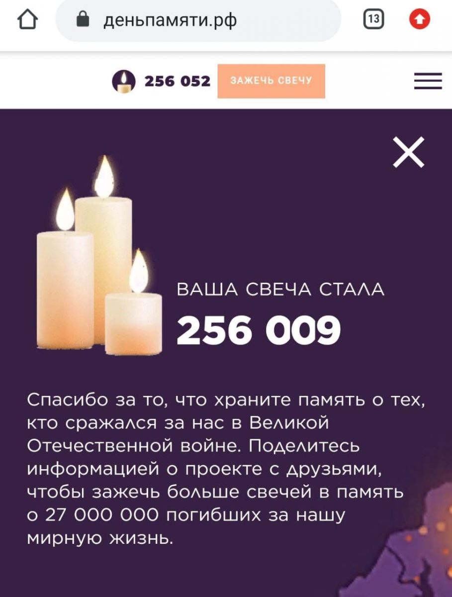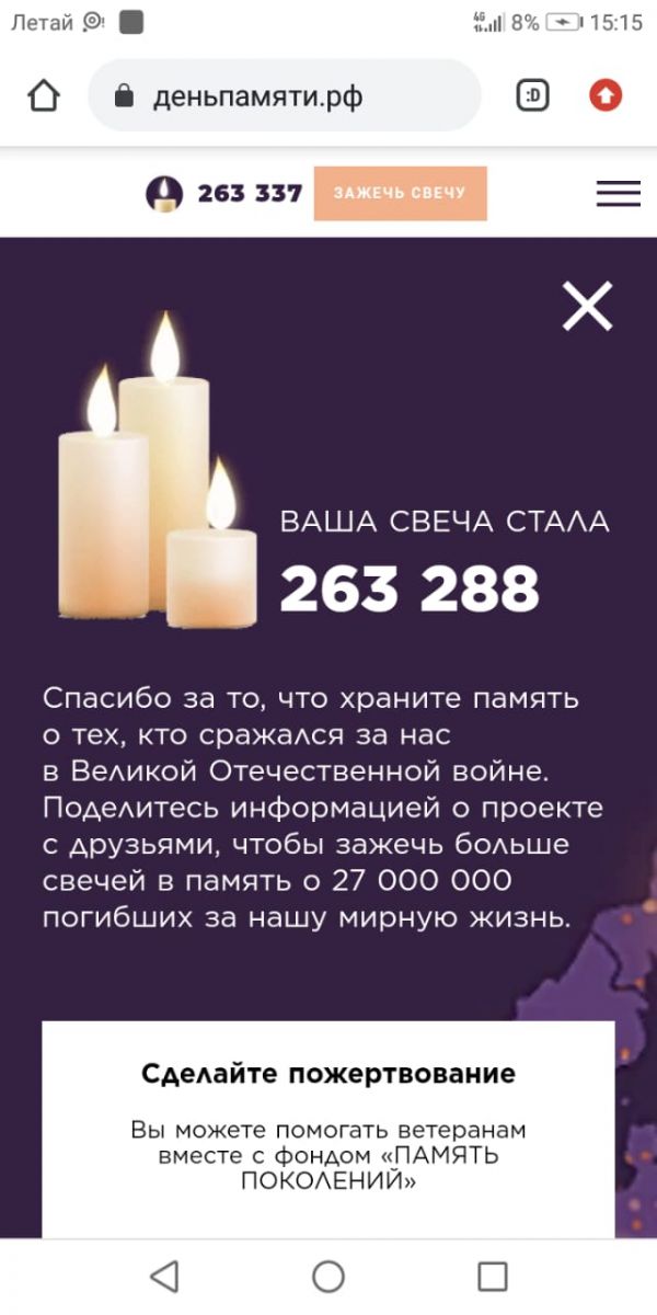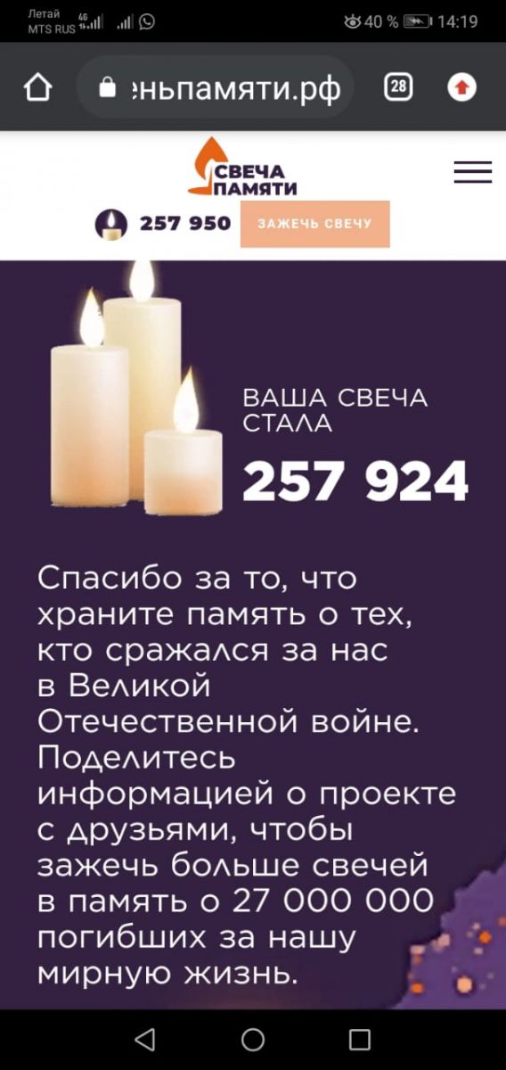 22 июня 2021 г. исполняется 80 лет со дня начала Великой Отечественной войны. Наша школа принимает участие в акции "Свеча памяти!". Учащиеся и учителя школы зажгли свечу памяти на сайте "Деньпамяти", почтив героев Великой Отечественной войны.