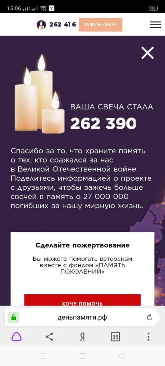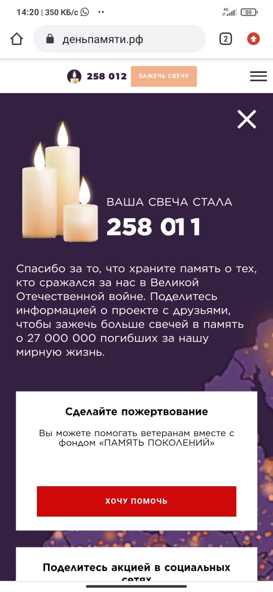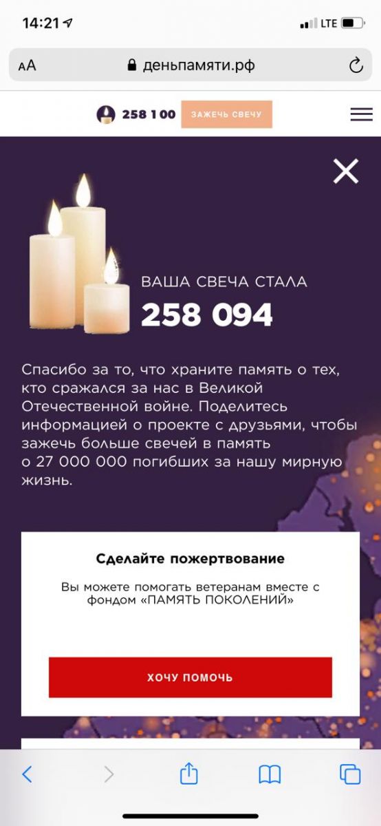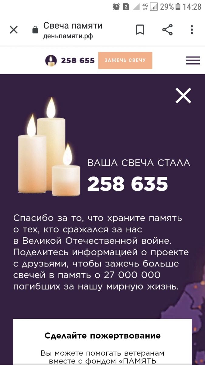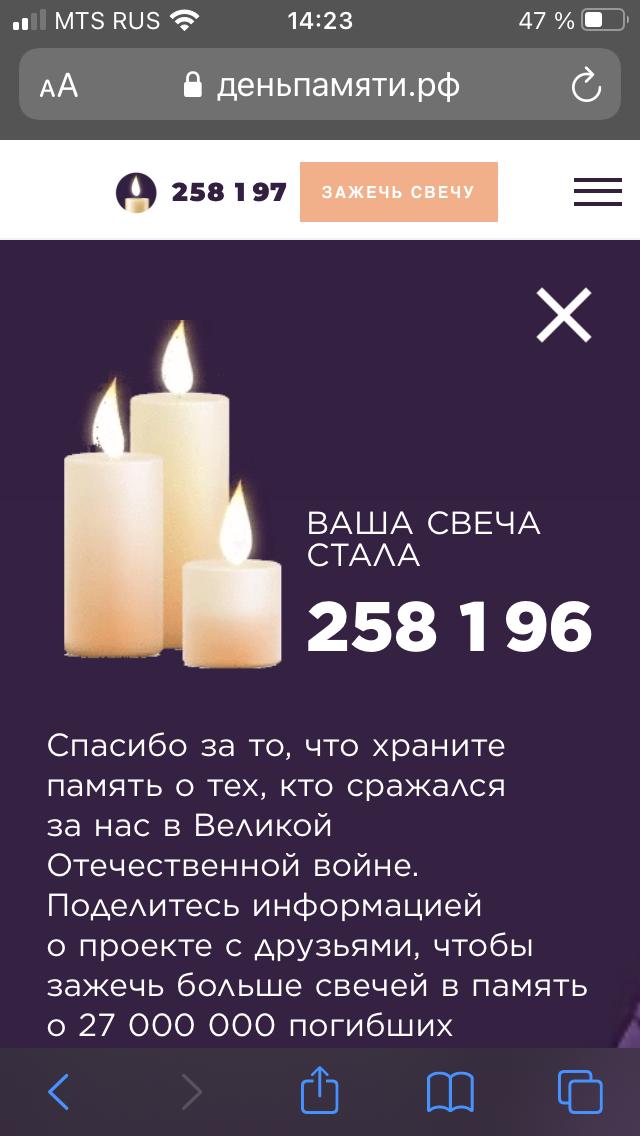 22 июня 2021 г. исполняется 80 лет со дня начала Великой Отечественной войны. Наша школа принимает участие в акции "Свеча памяти!". Учащиеся и учителя школы зажгли свечу памяти на сайте "Деньпамяти", почтив героев Великой Отечественной войны.