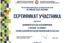 В целях реализации подпрограммы «Патриотическое воспитание молодежи на 2014-2016 годы» Постановлением Кабинета Министров Республики Татарстан о 09.04.2014 №228 Министерством образования и науки РТ и Советом по воспитательной работе профессиональных образовательных организаций с 1-10 ноября 2016 года состоялся заочный отборочный тур Республиканского конкурса патриотической песни «Я люблю тебя, Россия!». Целью Конкурса – создание условий для патриотического воспитания молодежи через вовлечение в творческую деятельность. На суд жюри было предоставлена видеозапись песни «Ты помни!», которую исполнила студентка 3 курса Акимова Наталья. Наташа была номинирована сертификатом участника. Поздравляем Наталью! Желаем здоровья, творческих успехов!