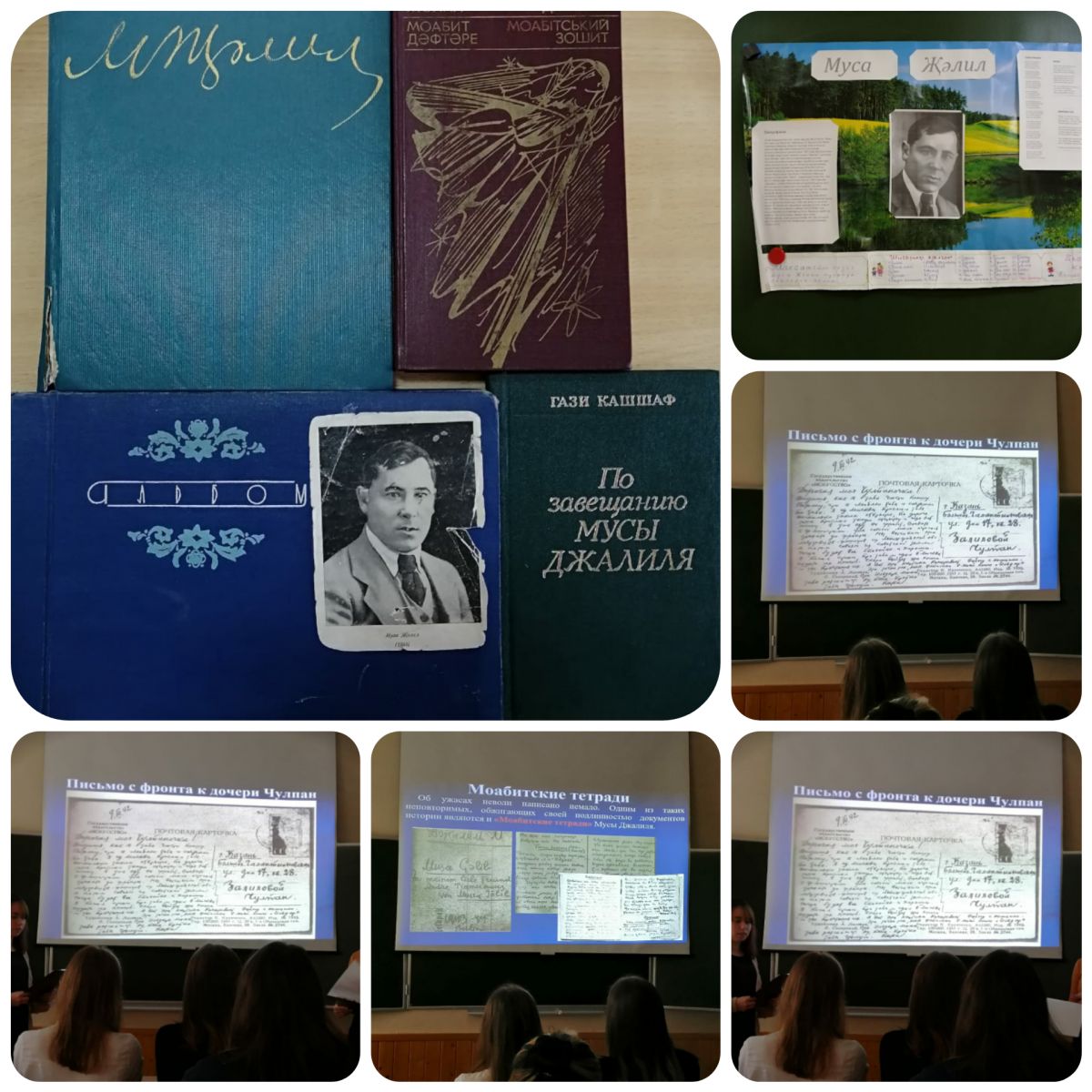 15 февраля 115-летие Мусы Джалиля. Накануне этой даты 10-классники провели классный час на тему «Муса Джалиль в наших сердцах». Бессмертные стихи звучали эхом в сердцах ребят. Стихи Джалиля — живое свидетельство мира его души. но одновременно являются свидетельством внутреннего мира чувств и мыслей многих людей.