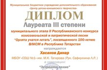Поздравляем, Хасанова Динара! Занявшего 3 место во II Республиканском конусе "Орлята учатся летать" , посещенного 100-летию ВЛКСМ в РТ 19.09.2019