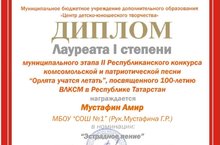 Поздравляем, Мустафина Амира! Занявшего 3 место во II Республиканском конусе "Орлята учатся летать" , посещенного 100-летию ВЛКСМ в РТ 19.09.2019