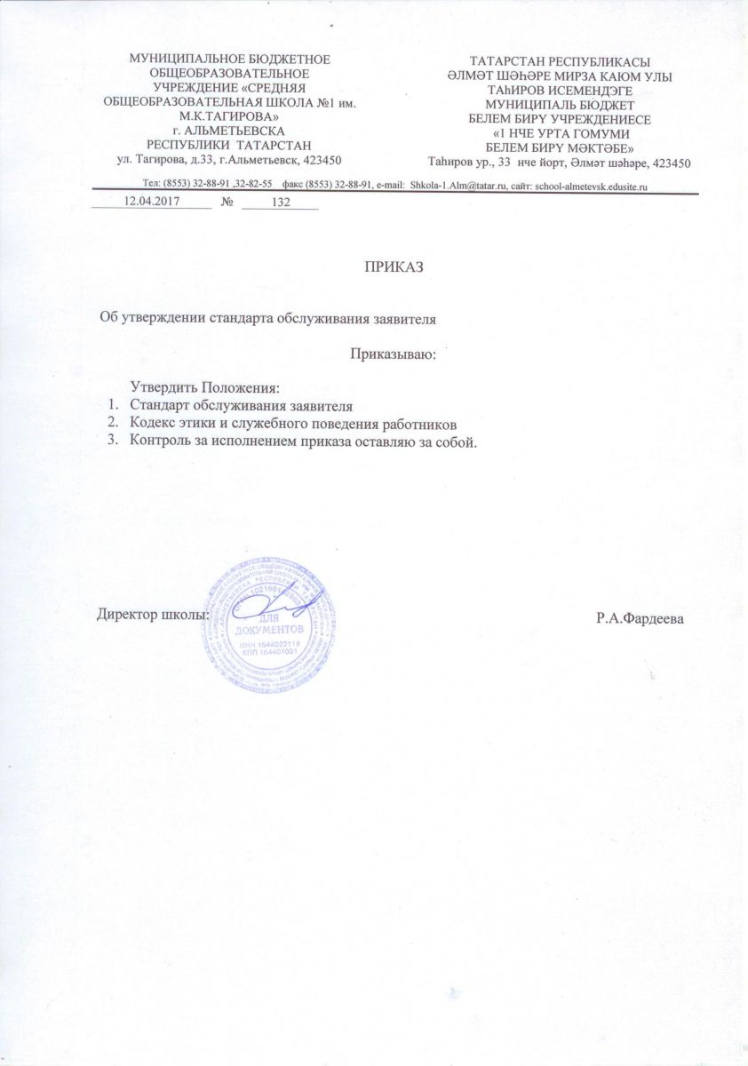 Приказ №132 об утверждении стандарта обслуживания заявителя