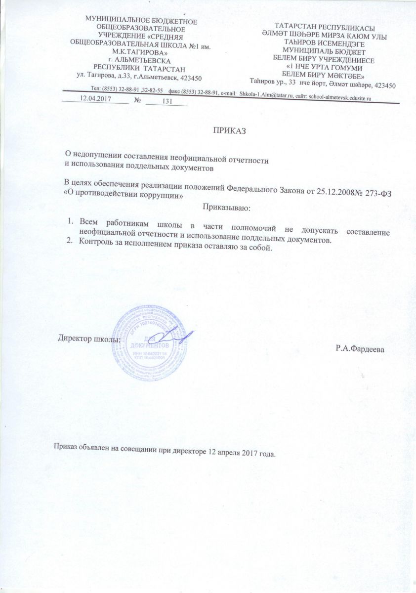 Приказ №131 о недопущении составления неофициальной отчетности и использования поддельных документов