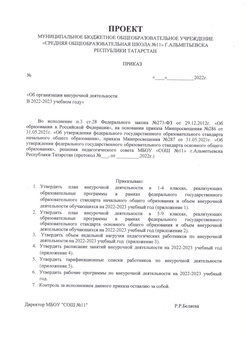 Приказ об организации внеурочной деятельности в 2022-2023 учебном году (проект)