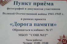 В рамках проекта "Дорога памяти" в нашей школе работает ПУНКТ ПРИЁМА фотографий и документов участников Великой Отечественной войны 1941 - 1945 г.