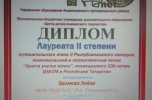 Учащиеся школы Кузьмин Матвей и Валиева Ляйля под руководством учителя Смолькиной И.Н.стали призерами Муниципального тура II Республиканского конкурса Комсомольской и патриотической песни.