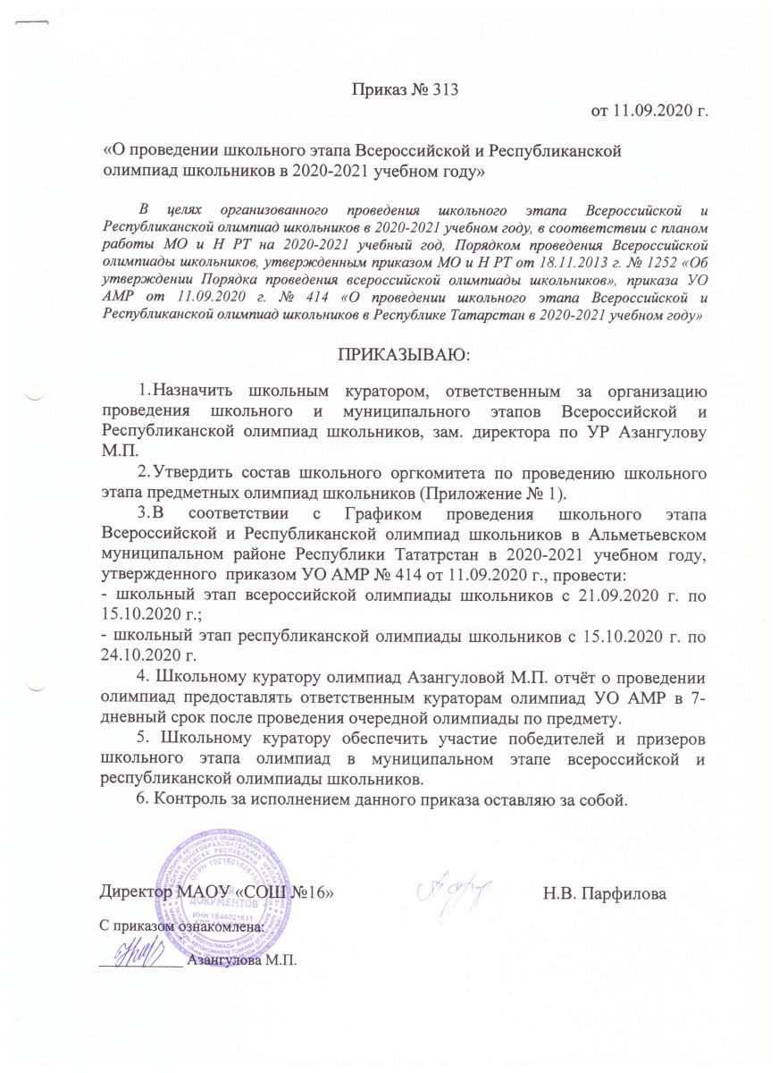 - О проведении школьного этапа Всероссийской и Республиканской олимпиад школьников в Республике Татарстан в 2020 - 2021 учебном году