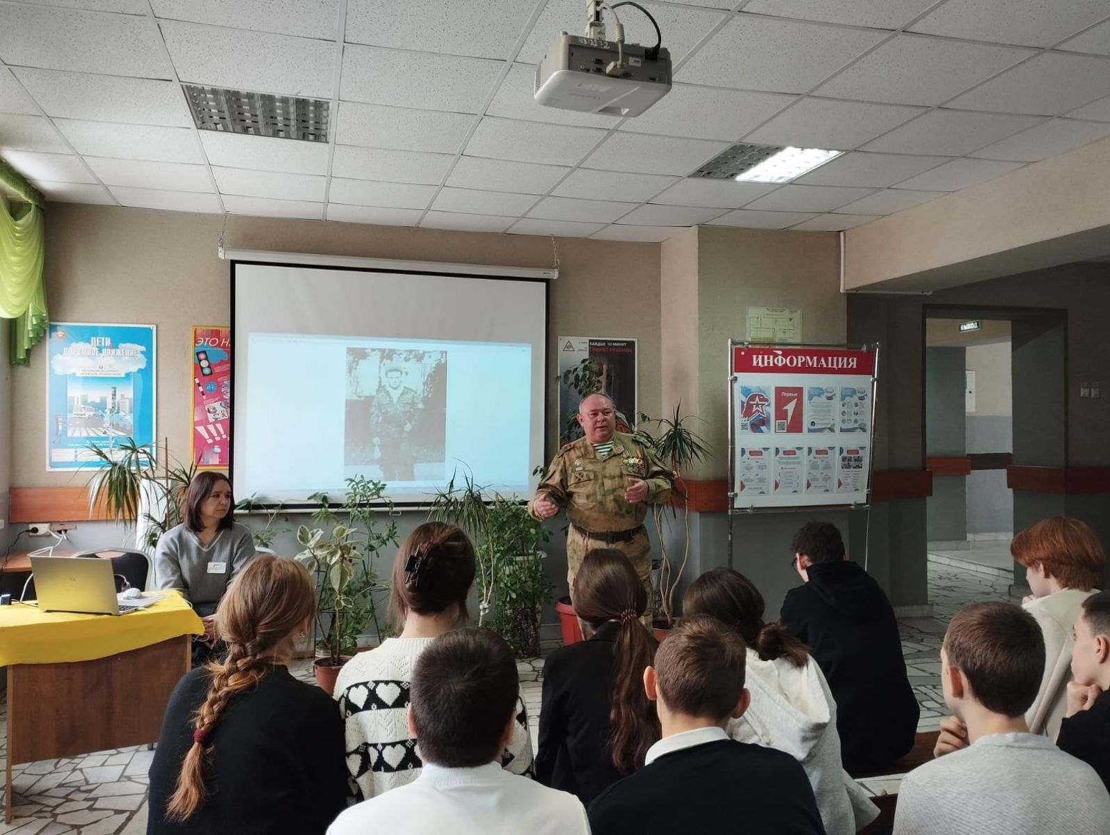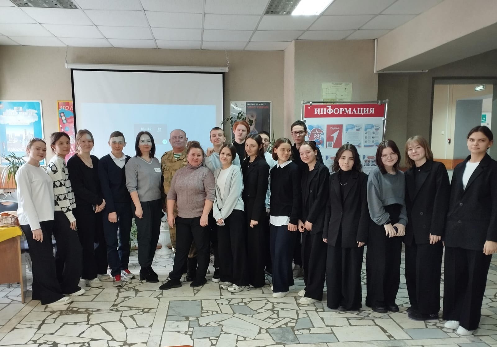 В рамках месячника гражданско-патриотического воспитания ученики 9б класса встретились с Шатриловым Виктором Михайловичем,который является Ветераном боевых действий на северном Кавказе и Специальной Военной Операции, Старшим прапорщиком,Членом Боевого Братства г. Альметьевск,участником поисковой вахты памяти " Ветеран" Волгоград( Рассошки) , "Татнефть Поиск" Оборона Ленинграда .На встрече присутствовал социальный координатор Государственного фонда "Защитники Отечества" Бикбова Роза Алмазовна