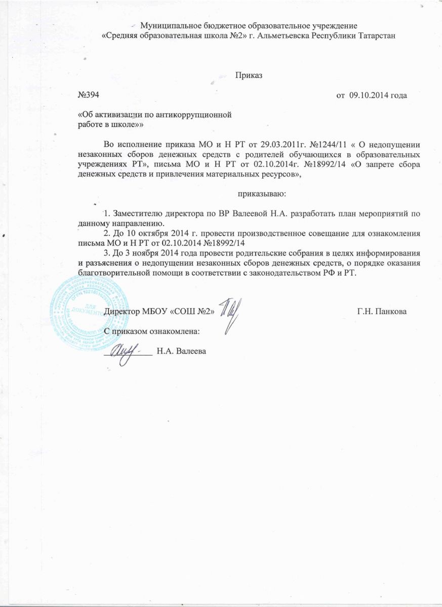 Приказ об активизации по антикоррупционой работе в школе