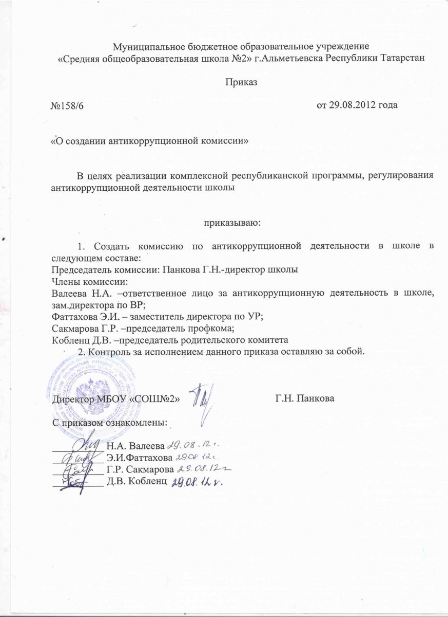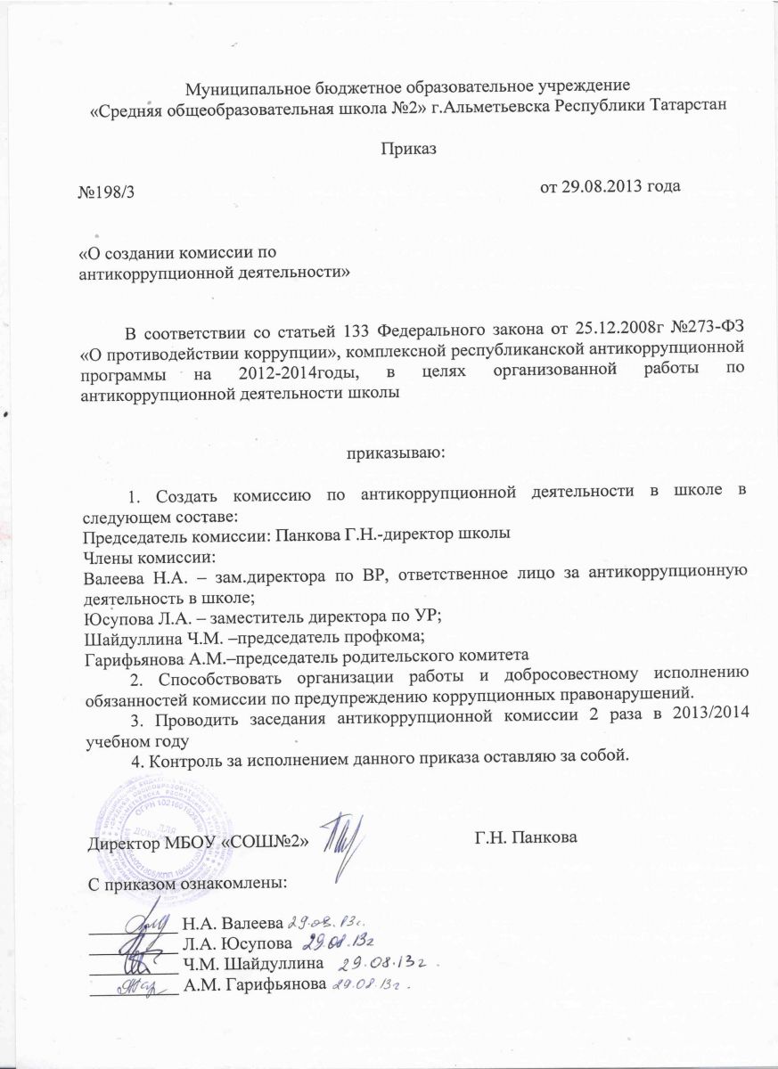 Приказ о создании антикоррупционной комиссии
