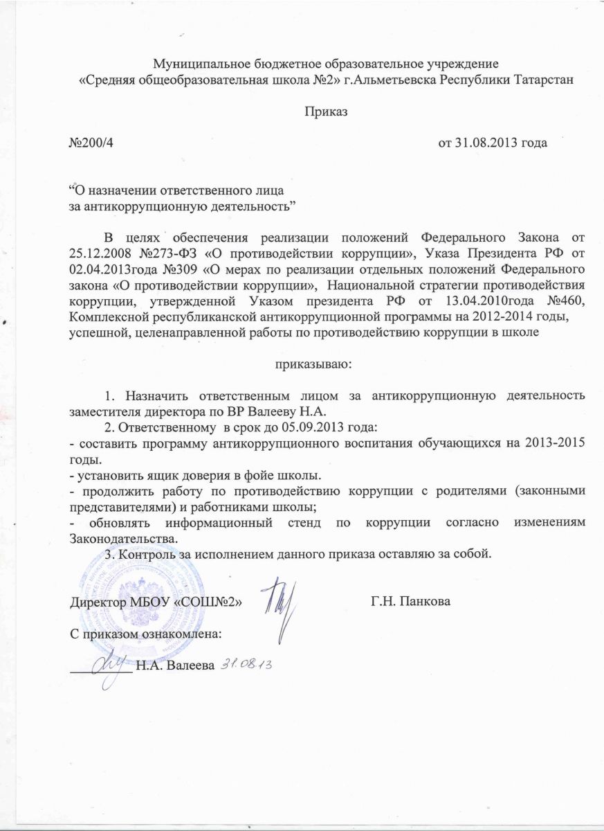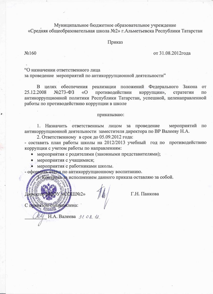 Приказ о назначении ответственного лица за проведение мероприятий по антикоррупционной деятельости