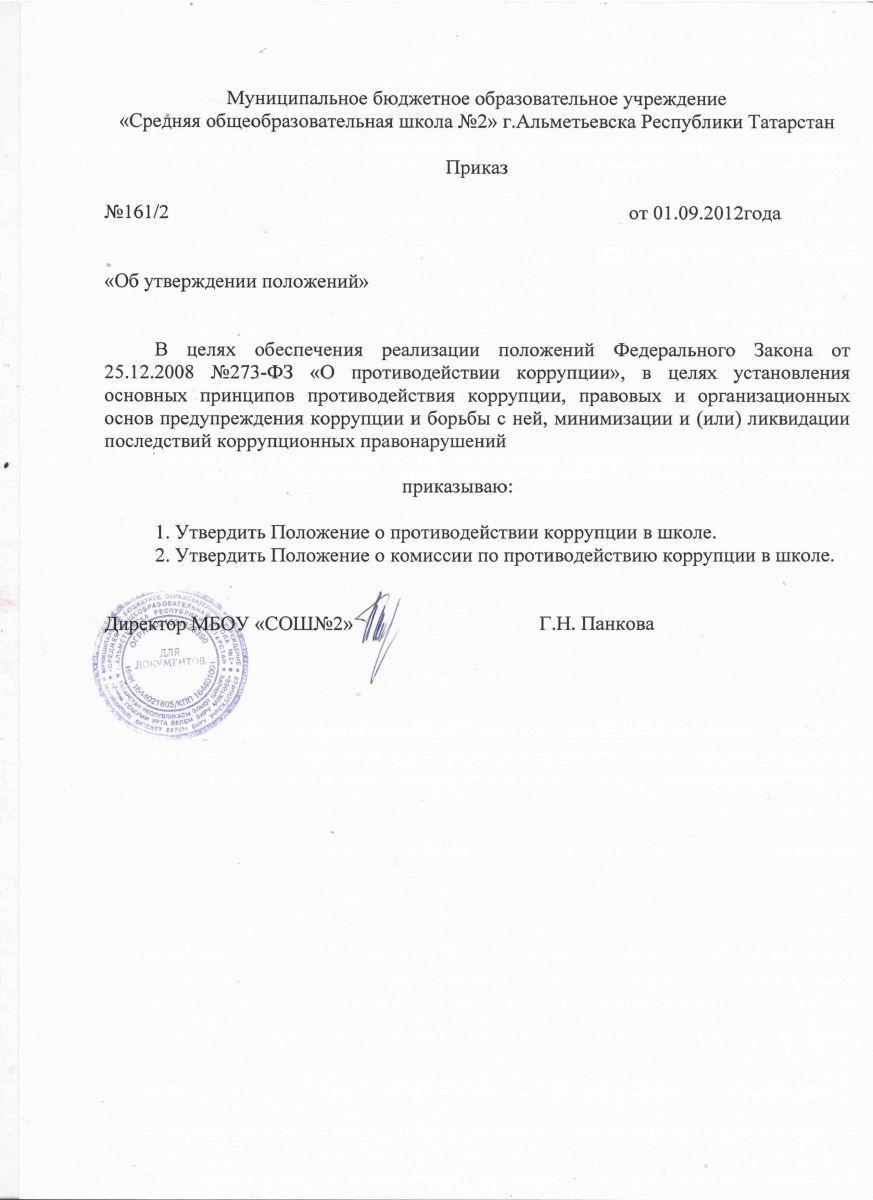 Приказ о предотвращении коррупции