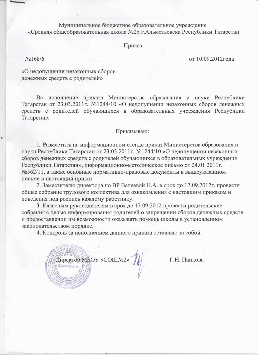 Приказ о недопущении незаконных сборов