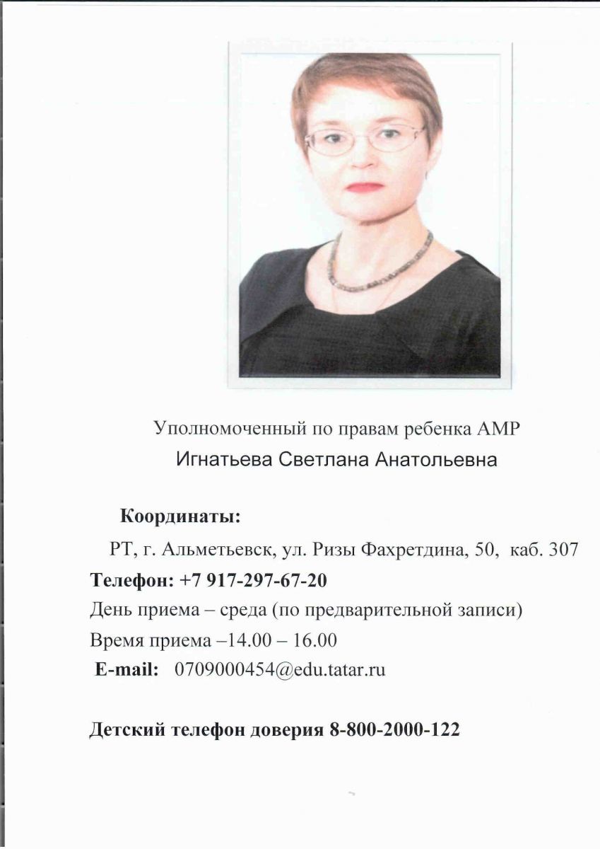 Уполномоченный по правам ребенка в Республике Татарстан: каждый вторник с 14-18 часов (по предварительной записи по тел.236-61-64)