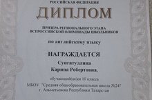 Педагогический и ученический коллектив школы 24 поздравляет ученицу 10 класса, призёра регионального этапа олимпиады по английскому языку -Сунгатуллину Карину и учителя английского языка Николаеву Альмира Рисхатовну! Молодцы!!!