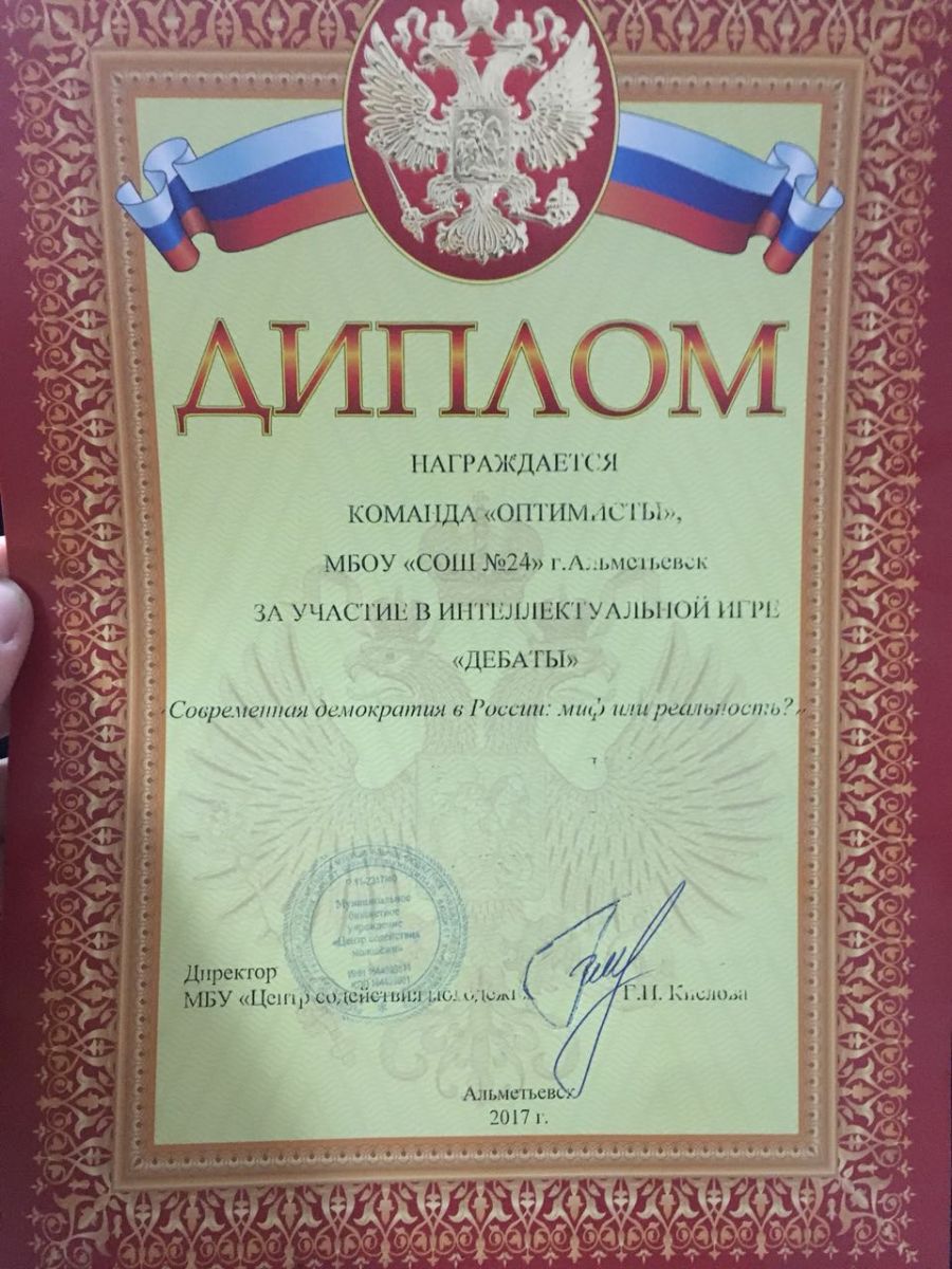 Опубликовано: 29.09.201729 сентября команда нашей школы в составе из 7 человек из 10Б и 11 Б классов приняла участие в дебатах посвященных теме демократии в России. Ребята показали свою осведомлённость в знании демократии, политических режимов и их признаков. Они доказывали точку зрения, которая говорила о том, что демократия в России – это реальность. И мы можем с гордостью сказать, что у них это получилось прекрасно. Диплом