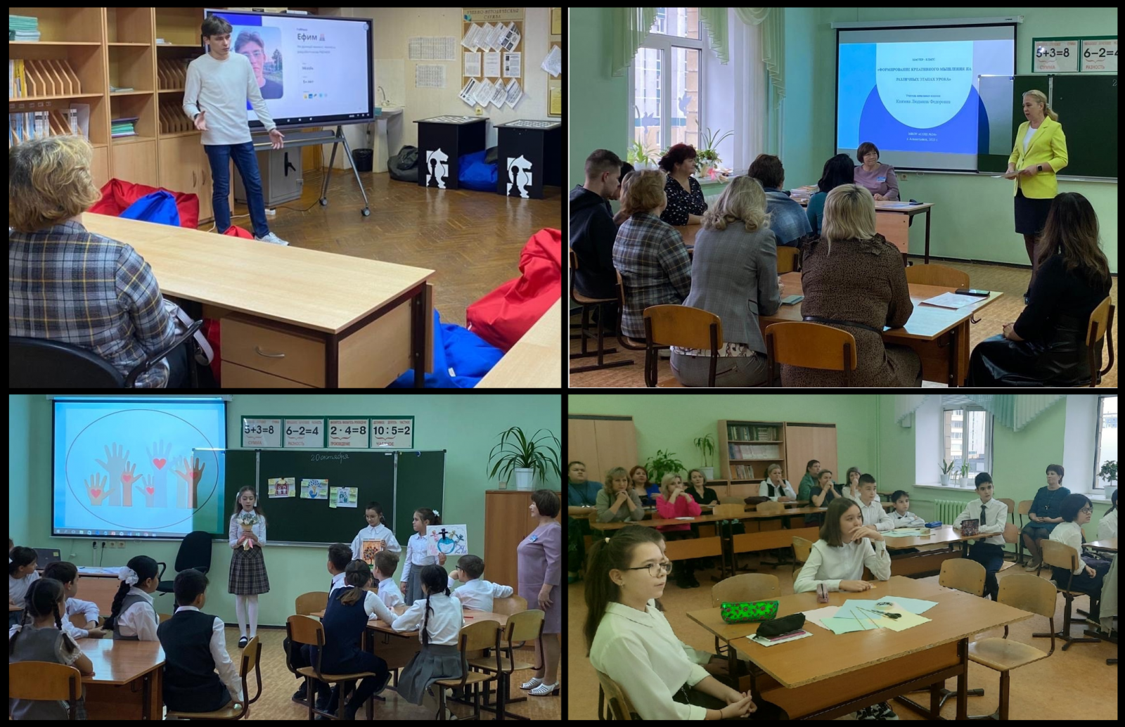 Опубликовано: 20.10.2023Учителя русского языка (Юсупова Л.Н.), начальных классов (Доценко Л.Г. и Князева Л.Ф.), математики (Цветкова Р.М.), английского языка (Самойлова Е.А.) и технологии (Волкова Э.Ф.) представили фрагменты уроков, мастер-классы с демонстрацией различных видов теоретического материала и практико-ориентированных заданий по формированию креативного мышления. Педагог-организатор (Марданшин Д.Д) и заместитель директора по ВР (Кремлева А.Д.) провели тренинги по развитию креативного мышления,используя игры на коммуникацию и развитие ораторского мастерства. Выпускник школы 2020 г. (Голиков Е.А.) провел коуч-сессию по стартапам в IT.