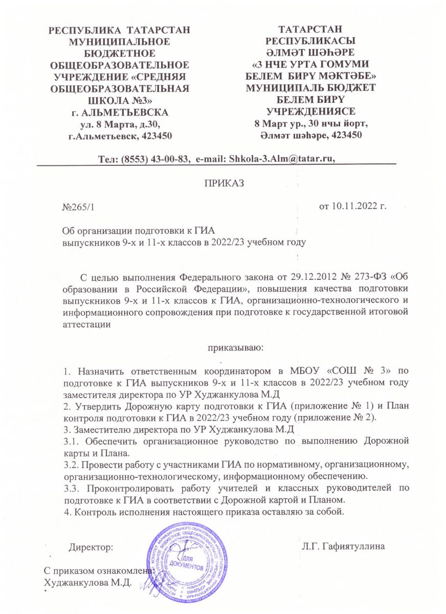 - Приказ Министерства образования и науки Республики Татарстан от 01.12.2021 № под/ 1582/21 "Об организации информирования участников образовательного процесса, выпускников прошлых лет и общественности по вопросам организации и проведения государственной итоговой аттестации по образовательным программам основного общего и среднего общего образования на территории Республики Татарстан в 2021/2022 учебном году"