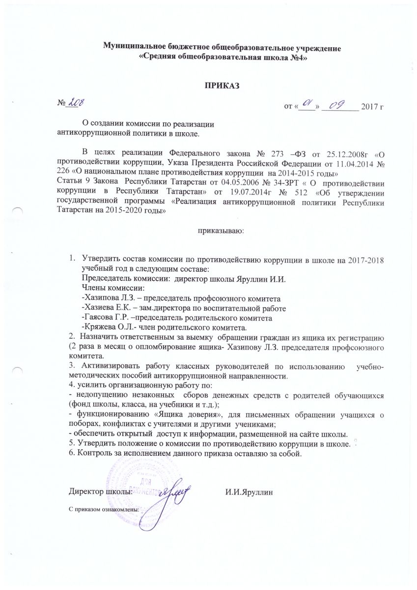 Приказ о создании комиссии по реализации антикоррупционной политики в школе от 01.09.2017 г