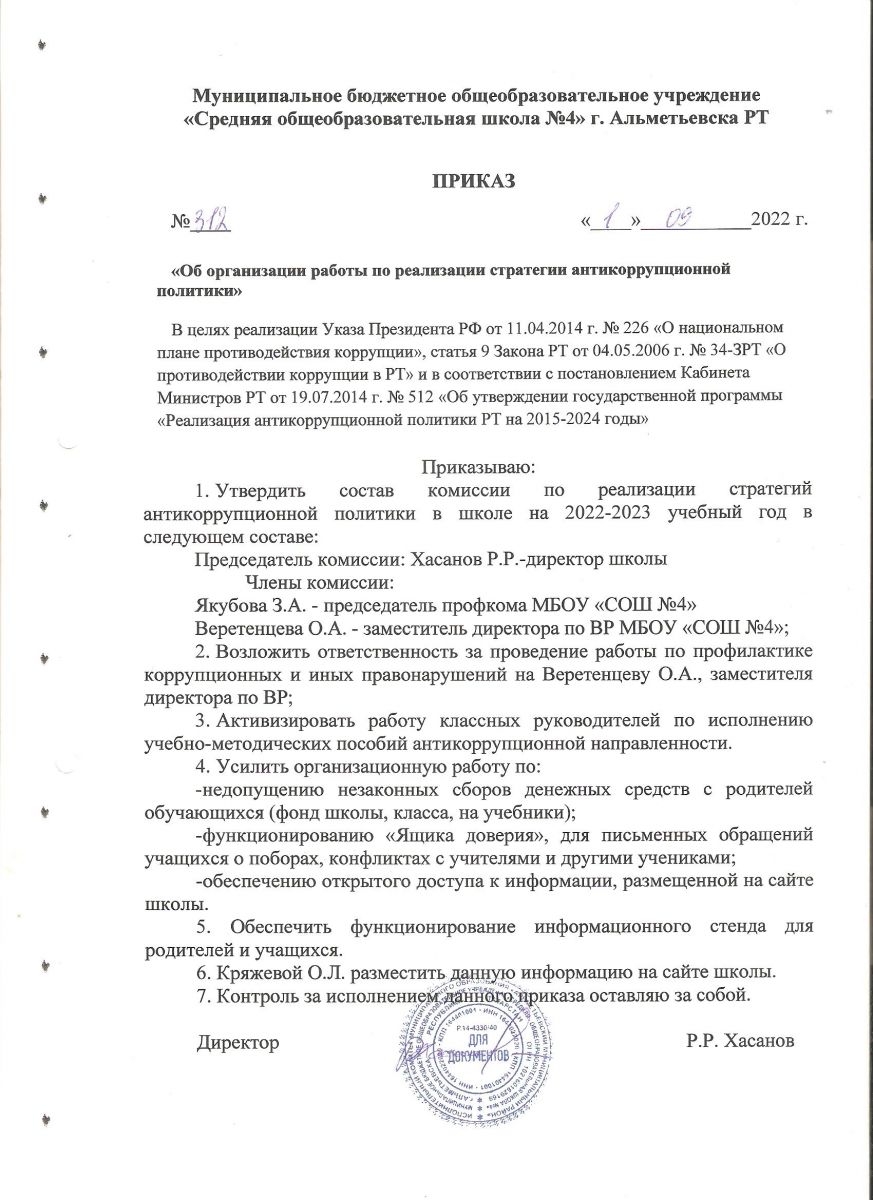 4. Приказ "Об организации работы по реализации стратегии антикоррупционной политики"