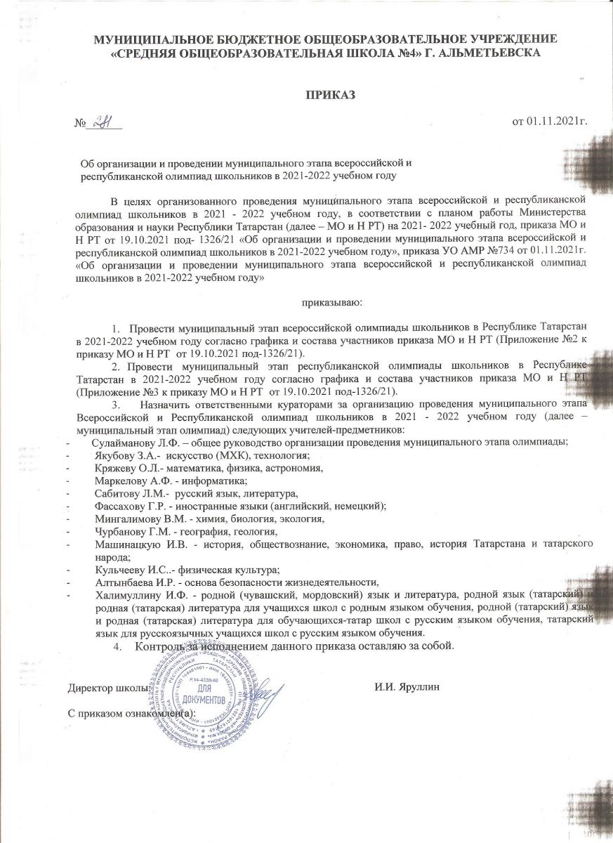 Приказ школьного этапа 2021-2022