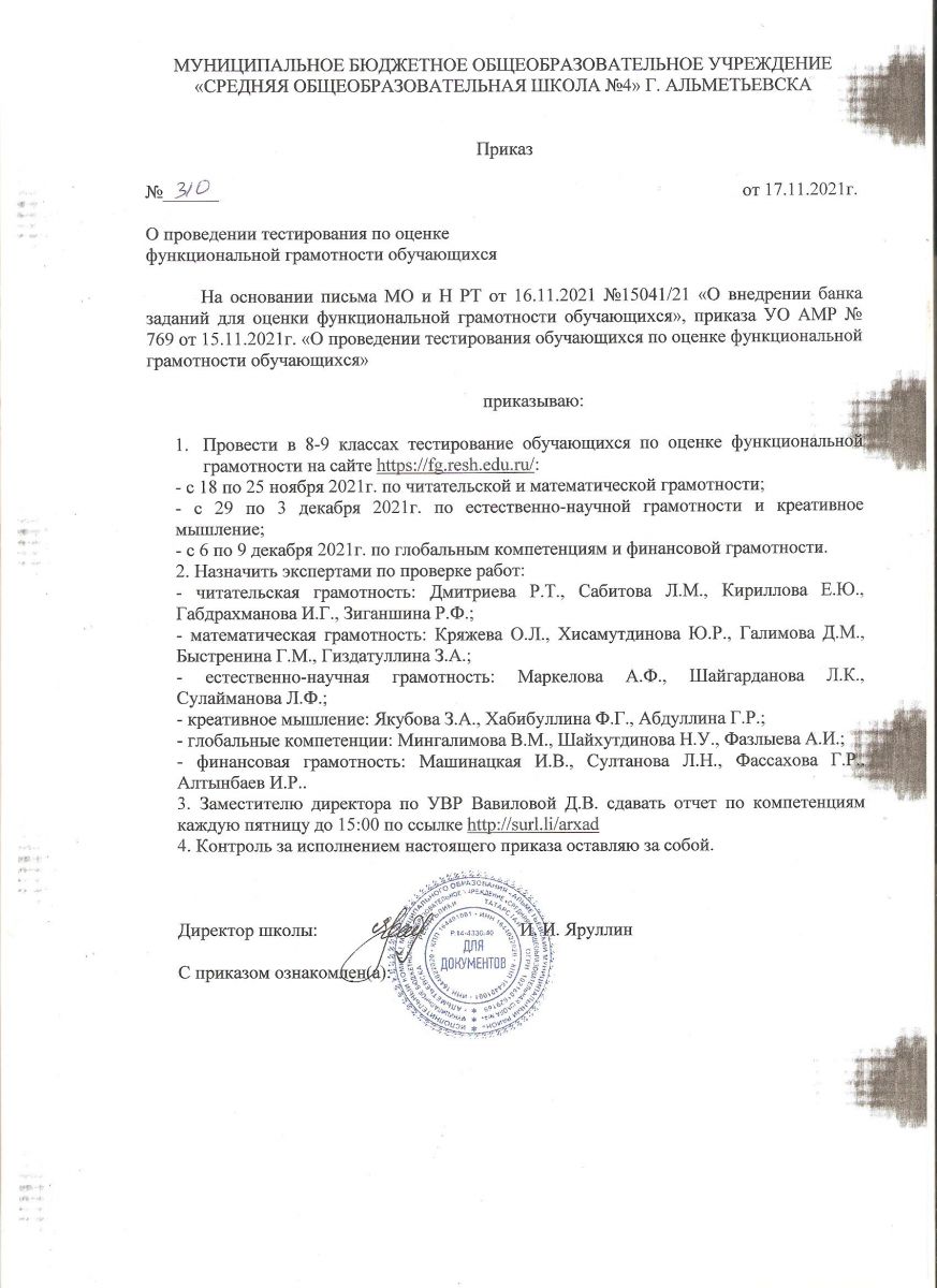 Приказ школы о проведении тестирования по оценке функциональной грамотности обучающихся