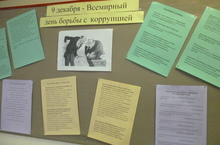 «Сколько лет коррупции?», «Что было раньше – коррупция или борьба с ней?» Ответы на эти и другие интересные вопросы осветил стенд, посвященный Всемирному дню борьбы с коррупцией. Интересные факты, мудрость народная в поговорках и пословицах, афоризмы наших современников, толкования значения слов данной тематики были интересны всем. Одно «цветное стёклышко» в калейдоскопе мероприятий, приуроченных к этой дате, мы показали. Остальное - за классными руководителями и учителями обществознания…