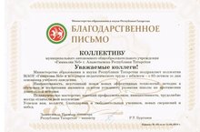 Министерство образования и науки Республики Татарстан выразило благодарность коллективу МАОУ «Гимназия №5» за педагогическое мастерство, высокий профессионализм, инициативность и трудолюбие.