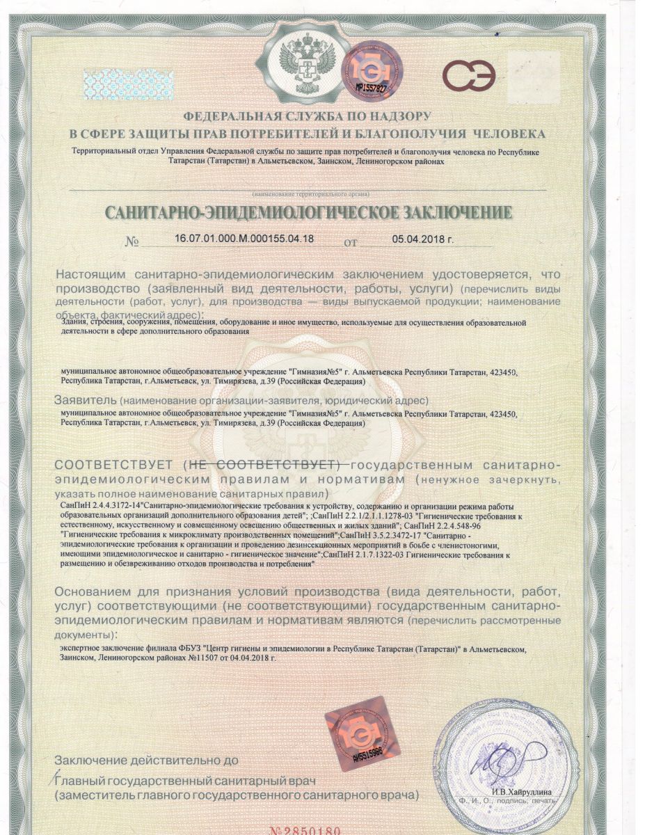 2. Санитрано-эпидемиологическое заключение 16.07.01.000.М.000155.04.18 от 05.04.2018 г.