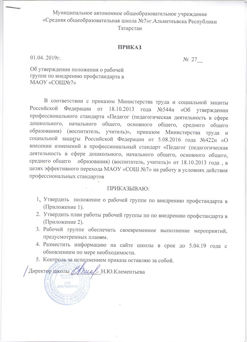 Приказ об утверждении положения о рабочей группе по внедрению профстандарта в МАОУ "СОШ 7"