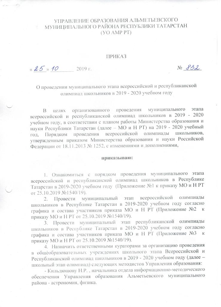 Приказ МО и Н РТ о проведении школьного этапа олимпиад 2019-2020