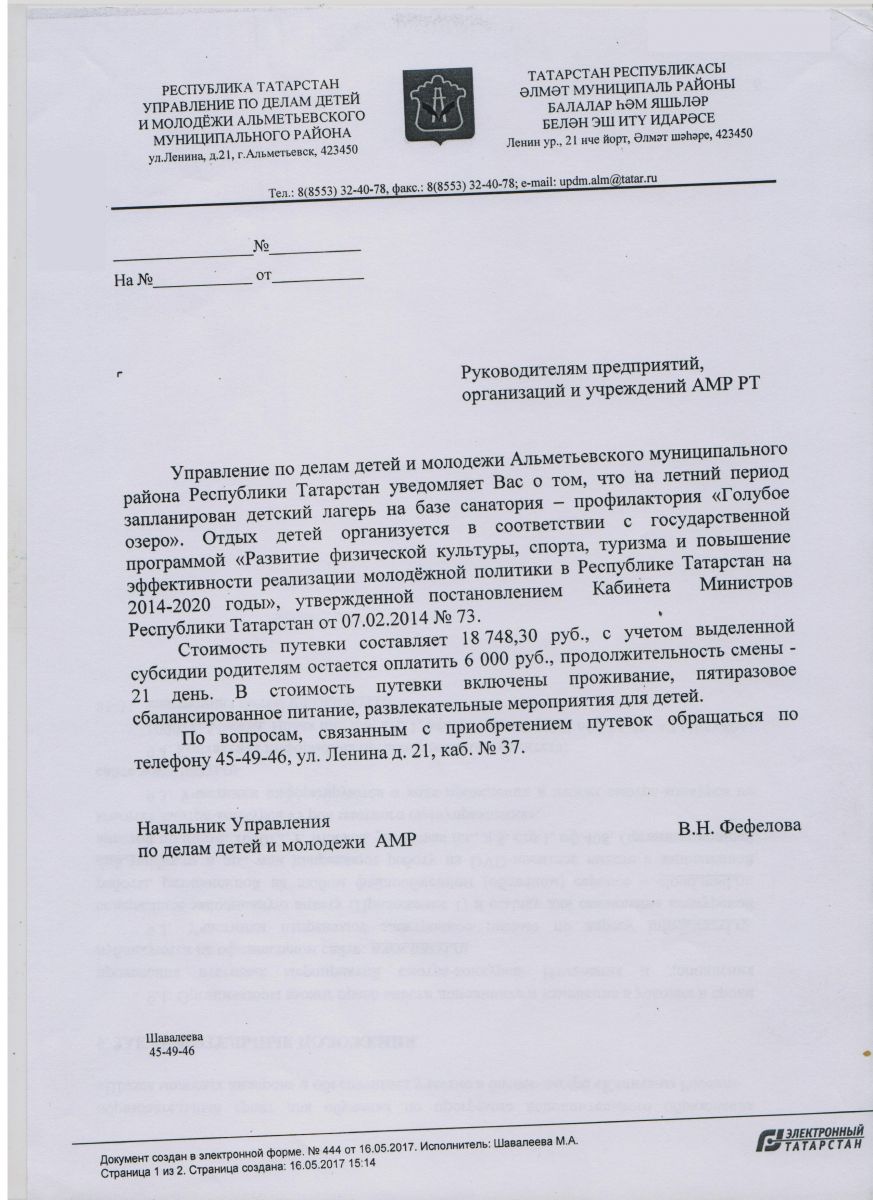 Опубликовано: 22.05.2017Управление по делам детей и молодежи Альметьевского муниципального района РТ уведомляет Вас о том, что на летний период запланирован детский лагерь на базе санатория - профилактория "Голубое озеро".
