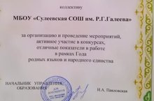 Культура любого народа сохраняется прежде всего в его родном языке. Наша школа - центр духовного наследия татарского народа, центр сохранения языка и культуры. Огромный вклад в сохранение и развитие родного языка вносит учитель татарского языка и литературы Гараева Гильмира Абдулловна. Ею проводятся открытые уроки и мероприятия, конкурсы и проекты. Педагог творческий, инициативный, неугомонный. Она всегда в поиске новых идей. Результат работы Гильмиры Абдулловны налицо: учащиеся нашей школы свободно говорят на родном татарском и русском языках, занимают призовые места в олимпиадах и конкурсах, хорошо знают культуру, историю своего народа. Одним словом, дети любят свой народ, родной язык. В рамках Года родных языков и народного единства учитель татарского языка и литературы МБОУ "Сулеевская СОШ" Гараева Гильмира Абдулловна награждена Благодарственным письмом Управления образования Альметьевского муниципального района за активное содействие и существенную помощь в организации и проведении мероприятий, активное участие в конкурсах в рамках Года родных языков и народного единства.