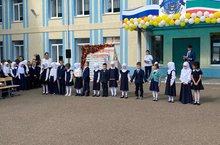 Нарядные ученики и ученицы с пестрыми букетами цветов, учителя, родители и гости заполнили школьный двор. Звучит музыка, и все классы строятся на школьном дворе. Все застыли на торжественной линейке под звуки гимна России и Республики Татарстан.