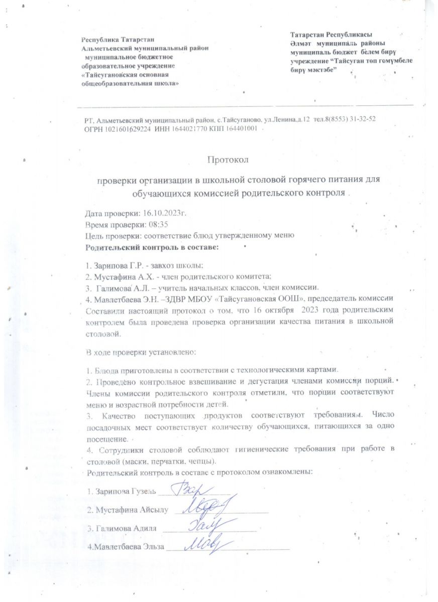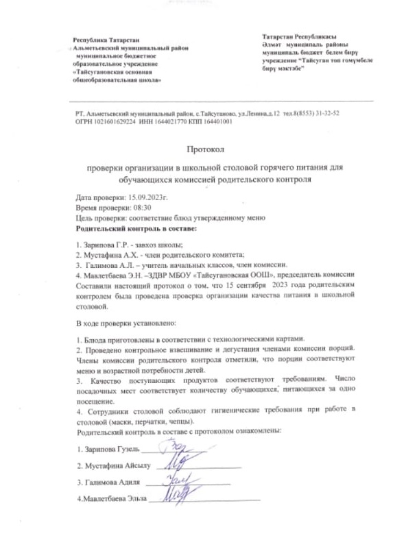 Документы по организации питания в МБОУ "Тайсугановская ООШ":