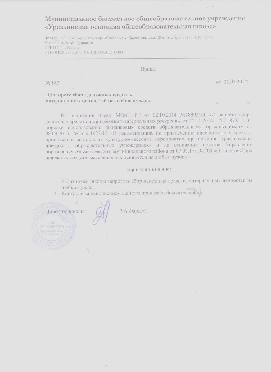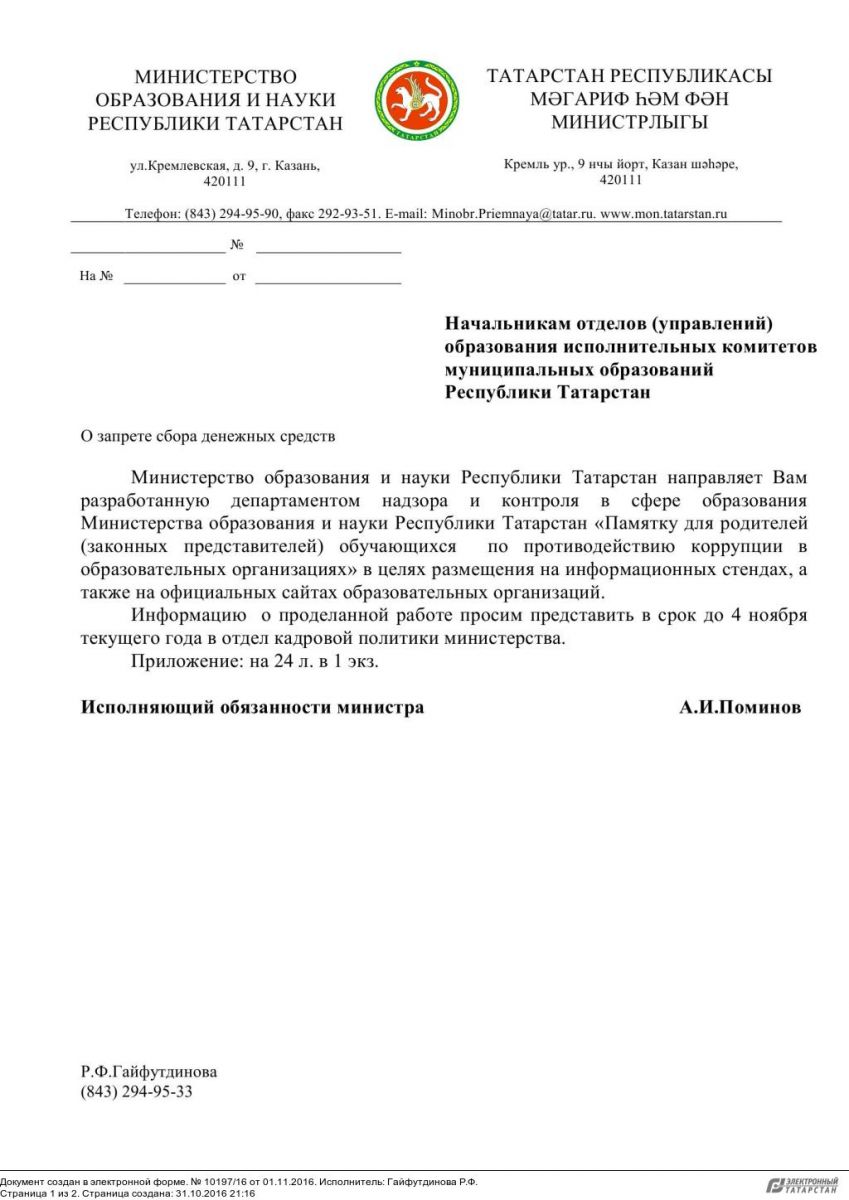 Письмо МОи Н РТ " О недопущении денежных сборов в школе" от 3.10 2014
