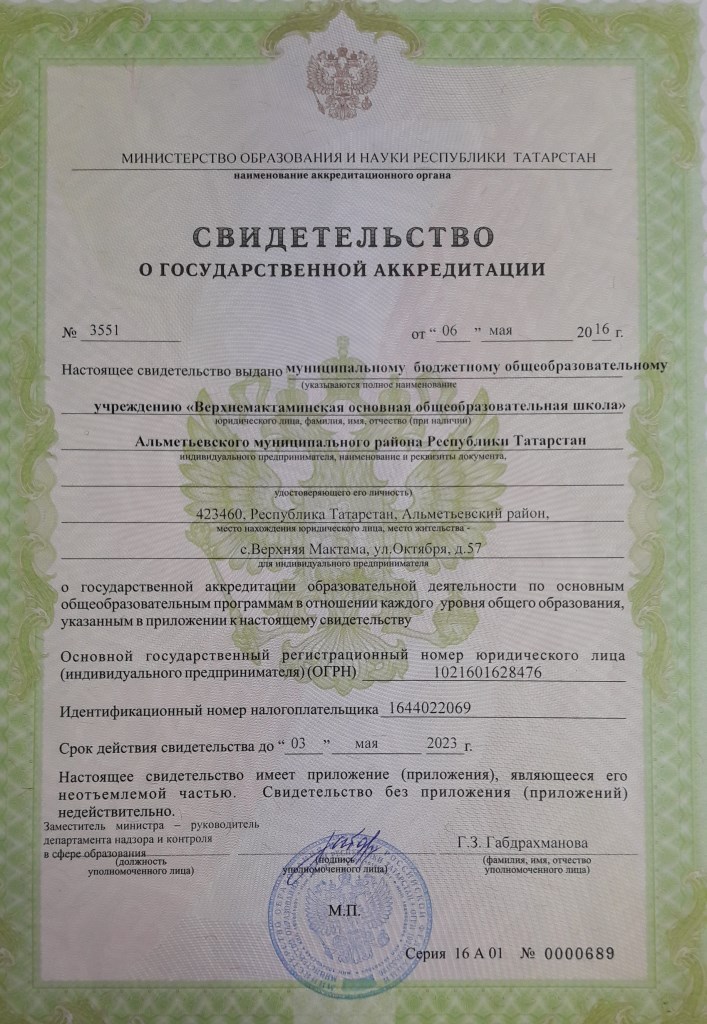 | Адрес: | 423460, РТ, Альметьевский район, с. Верхняя Мактама, ул. Октября, д. 57 |