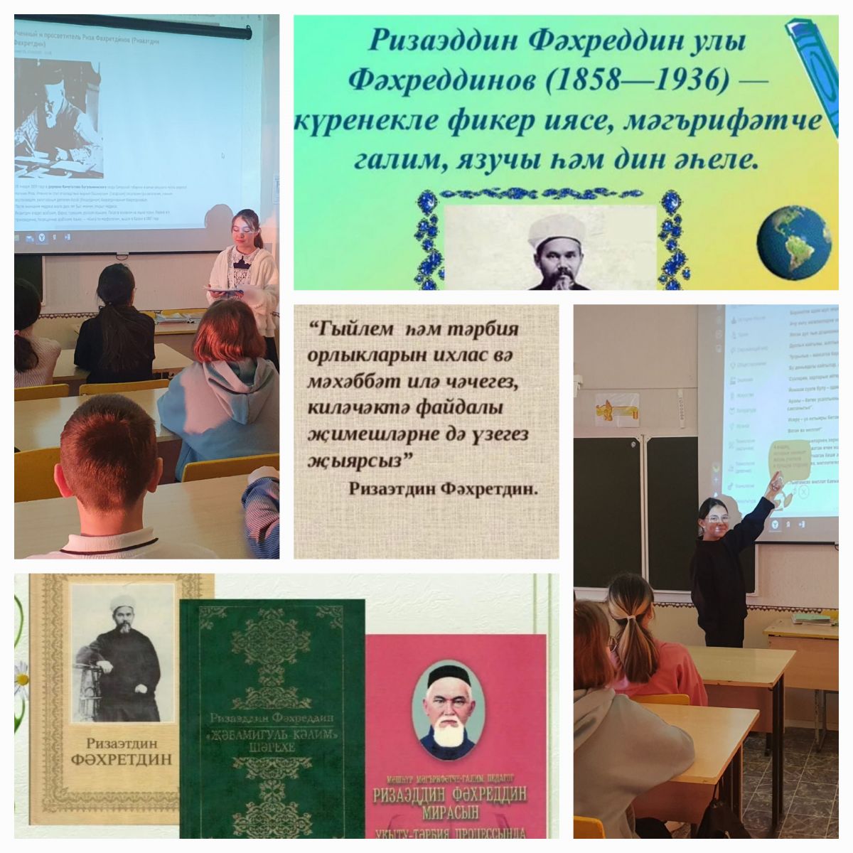 “Бала чакта алынмаган тәрбияне соңыннан бөтен дөнья халкы да биреп бетерә алмас” (Р.Фәхретдин) дигән тема белән тэрбия сәгате үтте. Анда Р. Фәхретдиннең тормышы һәм иҗаты турында сөйләнде. “Сәламәтлек”, “Гаилә – бәхет ачкычы”, “Туганнар”, “Якын карендәшләр”, “Күршеләр”, “Өй эчендә, “Мәктәп”, “Гыйлем”, “Йөз әдәпләре”, “Кул әдәпләре”, “Кием әдәпләре”, “Сөйләшү әдәпләре”, “Дин әдәпләре”, “Тугрылык”, “Үз хатаңны үзең тану”, “Кыю булу”, “Үз вазыйфаңны үзең белү”, “Хакыйкатьне күзәтү”, “Намус” һәм башка темаларны өйрәндек. Р. Фәхретдин иҗаты буенча стенд төзелде.