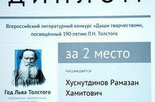 Хуснутдинов Рамазан учащийся МБОУ«В(С)ОШ№1», получил приглашение учиться в КФУ, заняв 2 место во Всероссийском литературном конкурсе «Дыши творчеством», посвященном 190-летию Л.Н.Толстого (под руководством учителя русского языка и литературы)