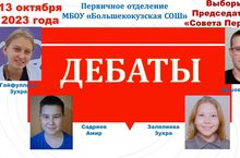 12 октября в нашей школе прошли дебаты кандидатов на пост Председателя «Совета Первых». Баллотируются 4 кандидата: Гайфуллина Зухра (10 кл.), «Залялиева Зухра (7 кл.), Ершов Артем (7 кл.), Садриев Амир (7 кл.).