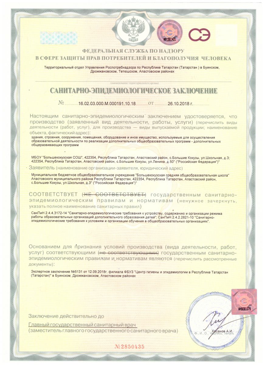 Санитарно-эпидемиологическое заключение от 26.10.2018г