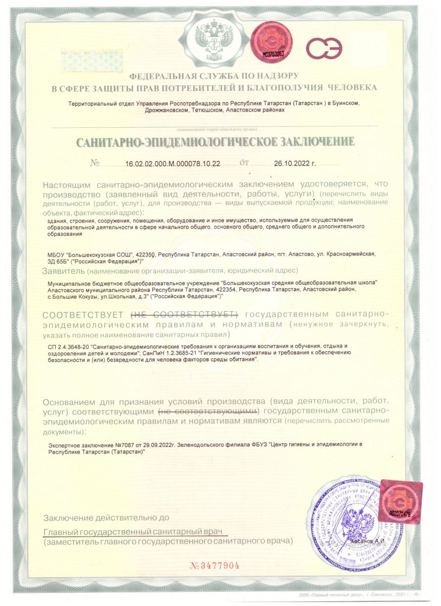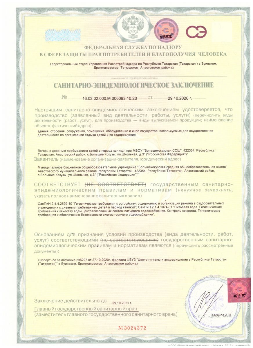 Санитарно-эпидемиологическое заключение от29.10.2020г