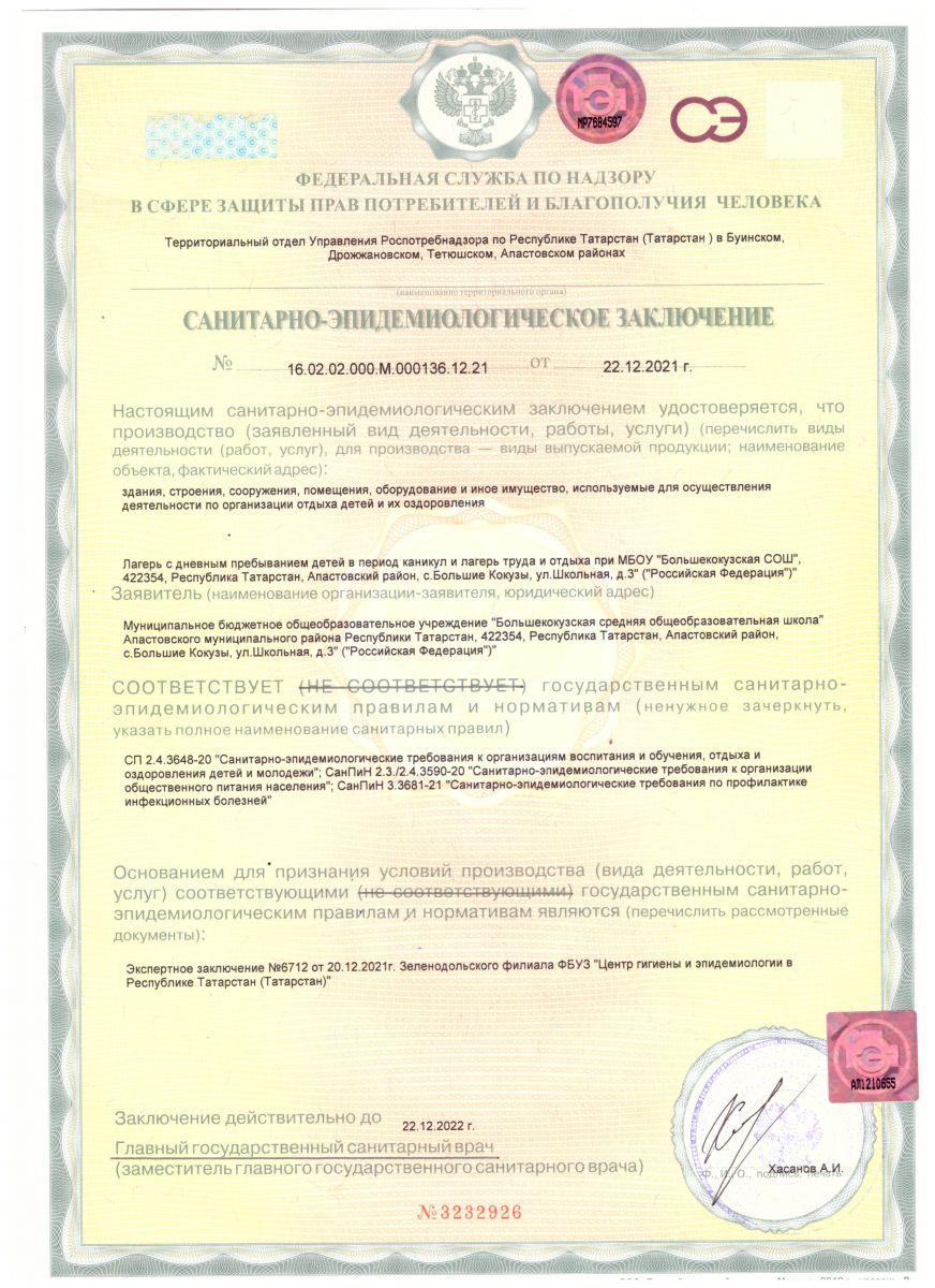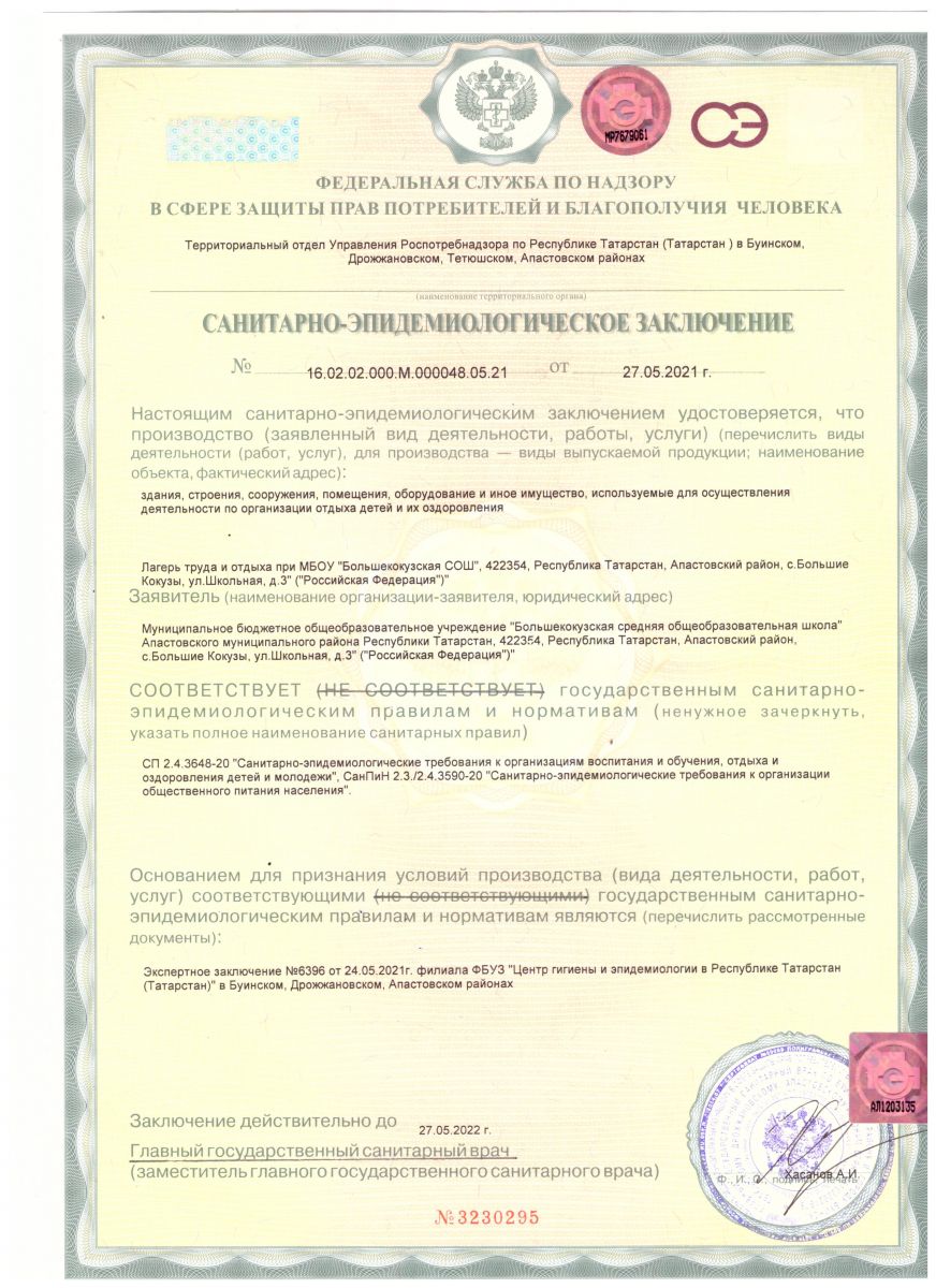 Санитарно-эпидемиологическое заключение от 27.05.2021г