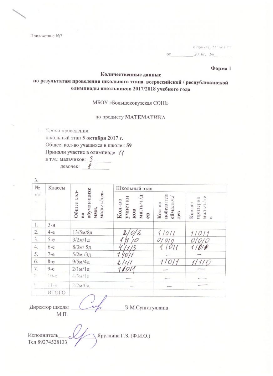 На муниципальном этапе в этом 2017- 2018 учебном году Всероссийской и республиканской олимпиады участвовали 44 учащихся. По 9 предметам Всероссийской олимпиады школьников 3 учащихся стали победителями, 5учащихся завоевал статус призера. На республиканской олимпиаде по 7 предметам 5 учащихся стали победителями, 7 учащихся завоевал статус призера.