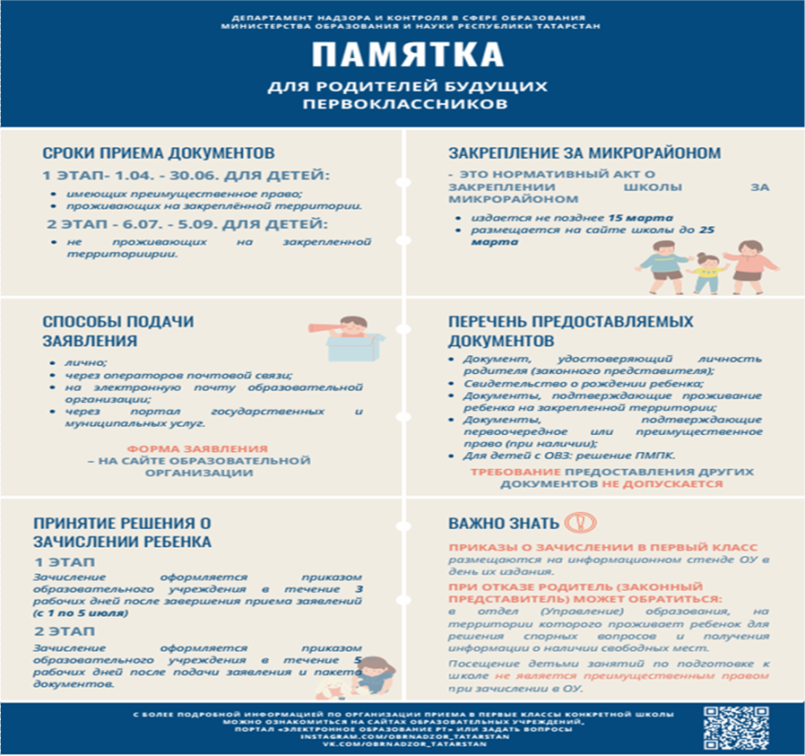 Если ребенок живет не на закрепленном за школой «участке», то подавать заявление родителям будущих первоклассников нужно с 6 июля . Если места остались - то в школу ребенка зачислят. Прием будет идти до заполнения свободных мест, но не позднее 5 сентября. В приеме государственная школа, может отказать только в случае, если свободные места закончились. При отсутствии свободных мест в школе родители (законные представители) обращаются в МКУ «Отдел образования Исполнительного комитета Апастовского муниципального района»