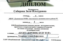 "Мин авылны сайлыйм" XI Республика фәнни эшләр,проект һәм иҗади эшләр бәйгесе узды.Әлеге бәйгедә 8 нче сыйныф укучысы Сабирова Зилә катнашты.Ул "Авыл булса,мин дә булырмын" бүлегендә беренче урын алды.Зиләгә тагын да зуррак уңышларга ирешүен телибез.