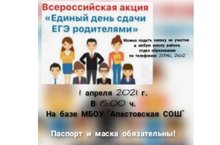 Приглашаем компетентных лиц, родителей (законных представителей) присоединиться ко Всероссийской акции "На все 100 сдаём вместе. День сдачи ЕГЭ родителями" 1 апреля 2021 г. в Апастовскую СОШ @mbou_apastovskaya